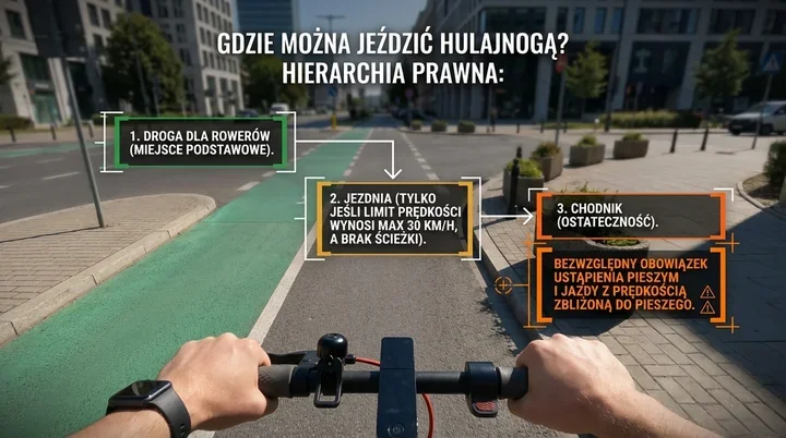 Hulajnoga elektryczna ma swoje miejsce na drodze i nie może być traktowana jak sprzęt do swobodnej jazdy po wszystkim, co znajdzie się pod kołami. Najpierw są drogi dla rowerów. Jezdnia wchodzi w grę tylko wtedy, gdy nie ma drogi rowerowej i obowiązuje ograniczenie do 30 km/h. Chodnik pozostaje wyjątkiem - wtedy trzeba jechać powoli i ustępować pieszym. Policja przypomina też o limicie 20 km/h, a do tego dochodzi obowiązkowe wyposażenie: światła, odblaski, dzwonek i sprawny hamulec.