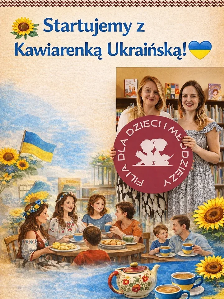 15 kwietnia 2026 r., godz. 16:30-17:30, Filia dla Dzieci i Młodzieży, ul. Wiktora Gomulickiego 13, tel. 29 764 51 45, e-mail: [email protected] - to właśnie tam ma ruszyć Kawiarenka Ukraińska. Dla jednych będzie to pierwszy taki kontakt, dla innych po prostu dobre miejsce, żeby usiąść, porozmawiać i poczuć się mile widzianym.