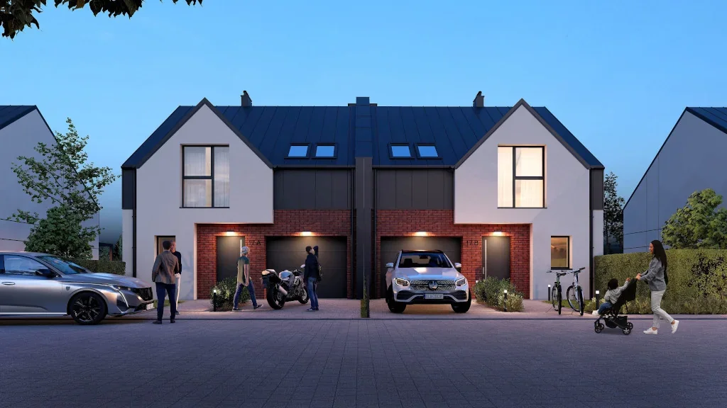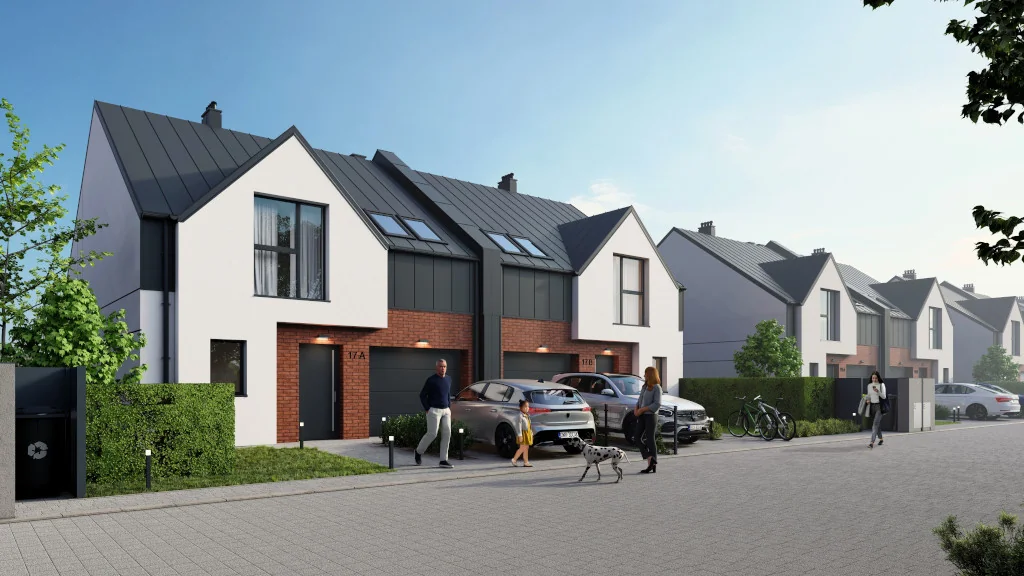 - Architektura z charakterem: To nie jest kolejne “pudełko”. Elewacja z tynku silikonowego z eleganckimi wstawkami imitującymi cegłę sprawia, że osada wygląda prestiżowo i nowocześnie, wyróżniając się na tle standardowej zabudowy podmiejskiej.