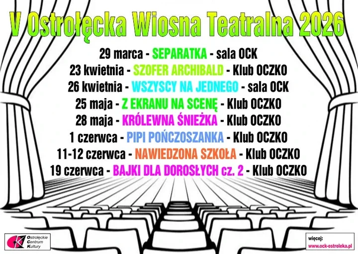 Najbliższe daty już same ustawiają tempo całego cyklu. W środę 23 kwietnia na scenie pojawi się SZOFER ARCHIBALD w Klubie OCZKO, a trzy dni później - 26 kwietnia - publiczność zobaczy WSZYSCY NA JEDNEGO w sali OCK. Dalej program płynnie przechodzi w maj i czerwiec, więc wiosenna teatralna trasa w Ostrołęce jeszcze się nie zamyka.