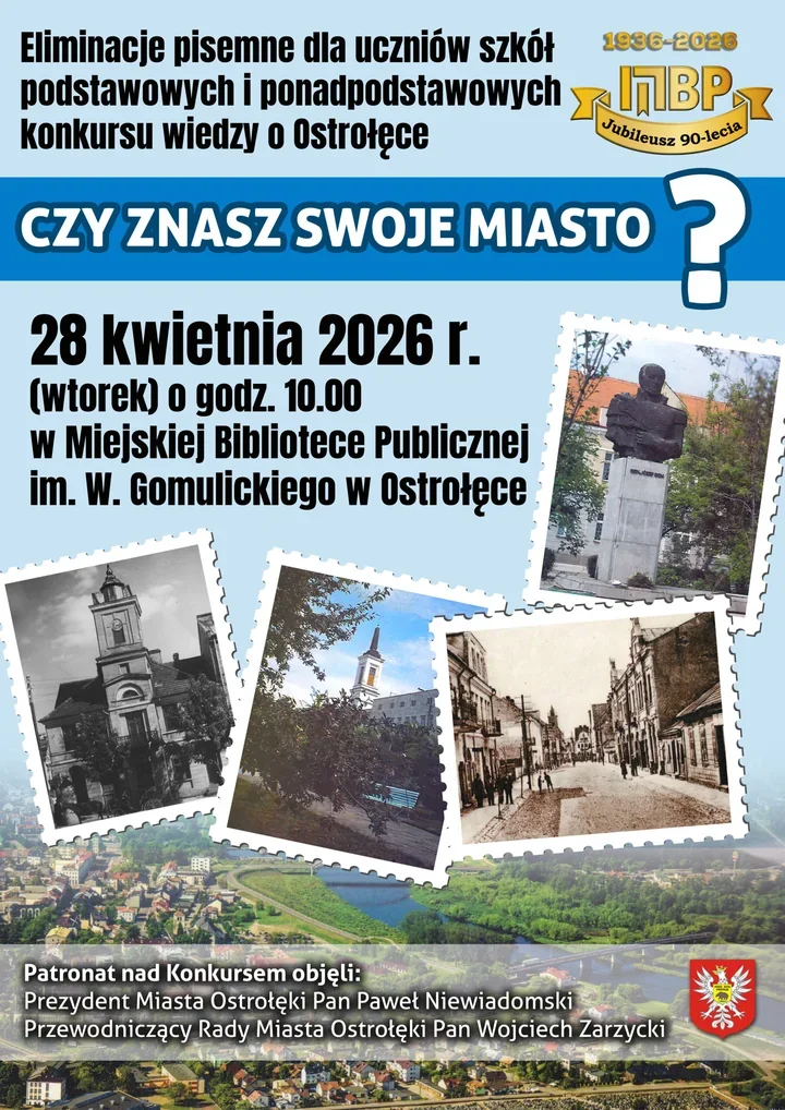 Pisemne eliminacje miejskiego konkursu wiedzy o Ostrołęce „Czy znasz swoje miasto?” odbędą się 28 kwietnia 2026 r. (wtorek) o godz. 10.00 w czytelni Miejskiej Biblioteki Publicznej im. Wiktora Gomulickiego w Ostrołęce. Do udziału mogą stanąć uczniowie szkół podstawowych oraz ponadpodstawowych, więc stawka jest szeroka - od młodszych pasjonatów lokalnej historii po starszych, którzy lubią sprawdzić się w miejskich tematach.