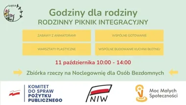Zapraszamy na rodzinny piknik integracyjny, który odbędzie się w siedzibie przy ul. Kołobrzeskiej 7. To bezpłatne, otwarte spotkanie łączy atrakcje dla dzieci oraz działania wspierające lokalną społeczność i wolontariat. Wydarzenie realizowane jest w ramach projektu „Godziny dla rodziny - przeciwdziałanie wypaleniu rodzicielskiemu”, finansowanego ze środków Narodowego Instytutu Wolności – Centrum Rozwoju Społeczeństwa Obywatelskiego w ramach Rządowego Programu Wsparcia Organizacji Pozarządowych „Moc Małych Społeczności”.
